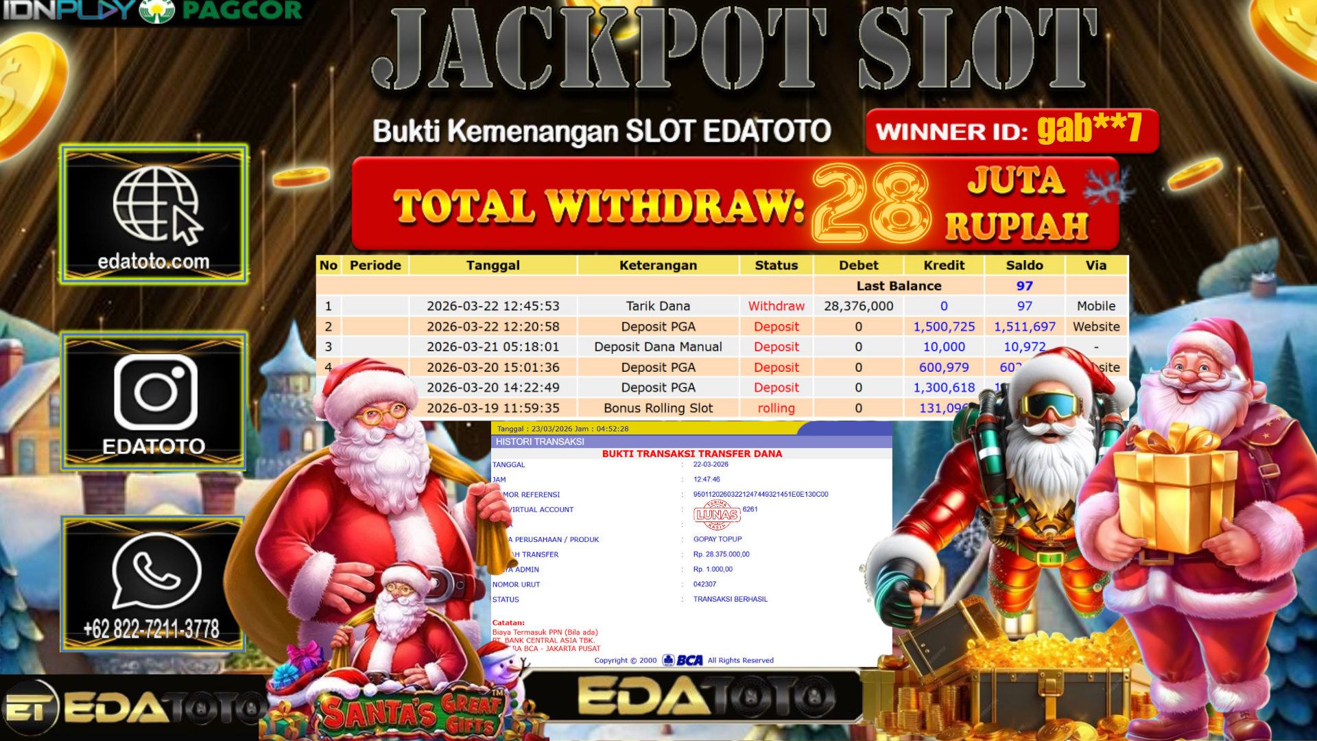 Selamat Kepada Pemilik user ID : cep******ak Hari/Tanggal : Sabtu / 21 MARET 2026 Jackpot : Rp, 25,000,000 JT Withdraw . . .